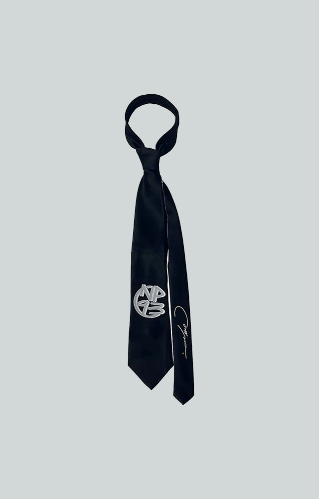 Corbata negra de corte clásico con el logo NP 93 bordado en la parte frontal. Diseño limpio y urbano, ideal para contrastar con prendas oversized o elevar looks formales con identidad.