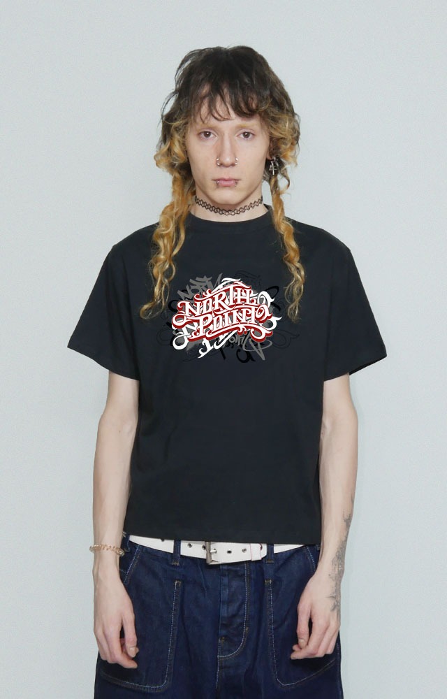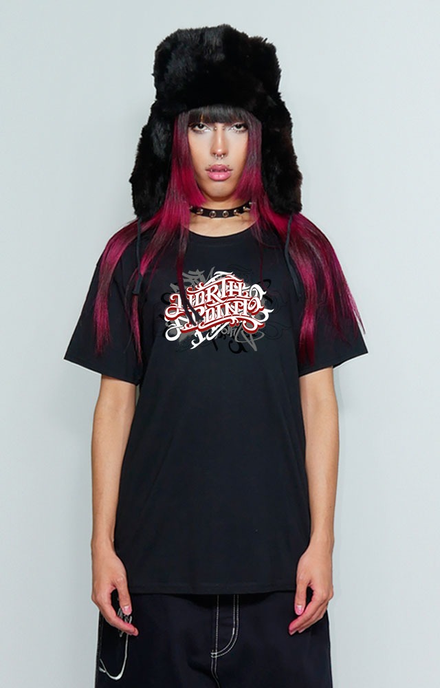 El diseño del logo gótico en rojo resalta sobre el fondo negro, dándole un toque único y llamativo a esta prenda. Perfecta para combinar con tus jeans favoritos o una sudadera oversized para un look urbano y desenfadado.