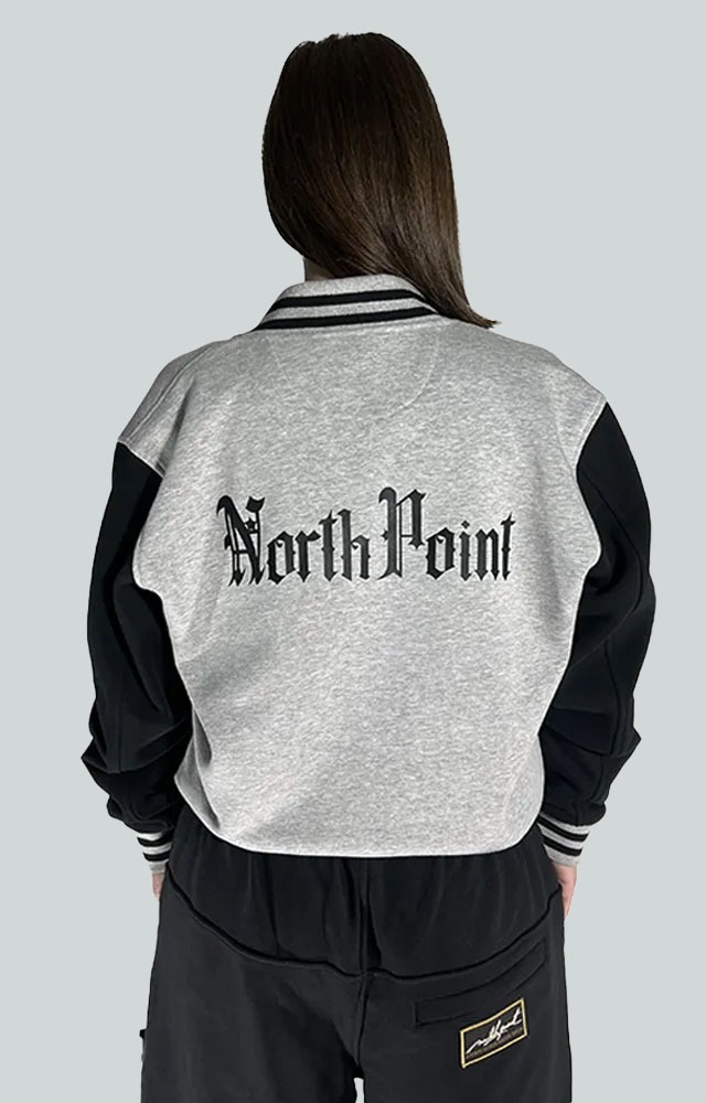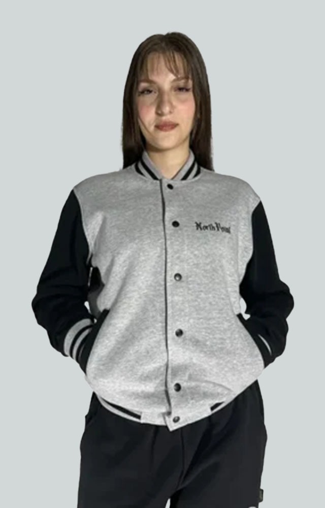Chaqueta varsity de corte oversized, con inspiración noventera. Cuerpo en gris jaspeado y mangas en negro contraste. Cuello, puños y bajo en canalé elástico con rayas deportivas. Cierre frontal con botones a presión metálicos. Logotipo North Point estampado en el pecho. Estilo urbano y relajado, ideal para combinar con joggers o bermudas.