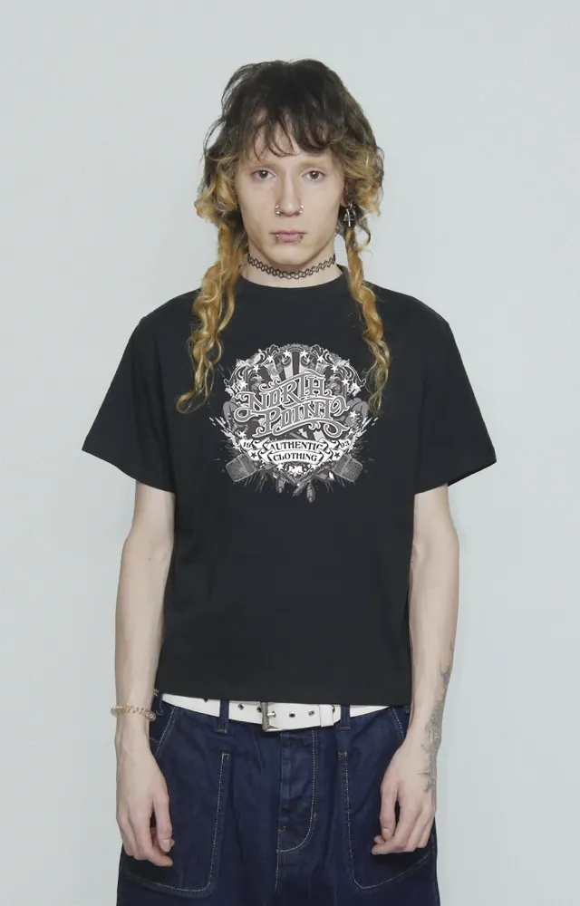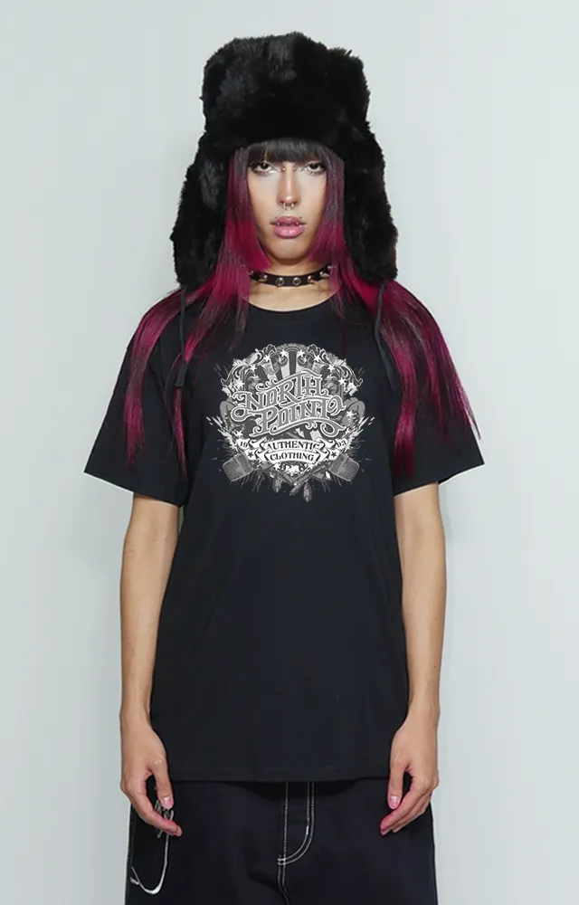 El diseño del logo gótico en rojo resalta sobre el fondo negro, dándole un toque único y llamativo a esta prenda. Perfecta para combinar con tus jeans favoritos o una sudadera oversized para un look urbano y desenfadado.